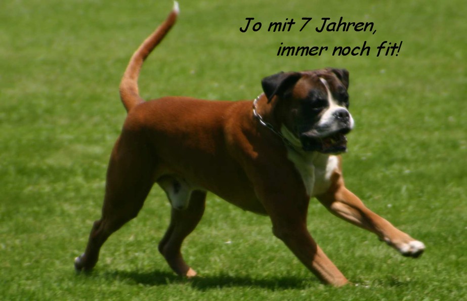 Jo hat mit 3 1/2 Jahren bereits 8 x erfolgreich die VPG 3 bestanden sowohl im Boxerklub als auch im HSV! Mittlerweile braucht er eine neue Leistungskarte, da die erste voll ist. Er wurde am 13. November 2005 von Frau Hartmann zur Körung B vorgeschlagen!! Somit sind von 4 Würfen seiner Mutter aus drei Würfen Hunde angekört! Er war erfolgreicher Teilnehmer an der Deutschen Meisterschaft VPG 2006 in Münster !! 2009 nahm er mit seiner 16 Jahre alten Hundeführerin Simone Semling im Alter von sieben Jahren erfolgreich an der Jugendmeisterschaft teil. Alle seine Würfe sind fehlerfrei. Seine Nachkommen werden erfolgreich auf Ausstellungen gezeigt , im Hundesport vorgeführt und zur Zucht eingesetzt. Und vor allem, von allen Besitzern geliebt. Er ist der Papa unseres A-Wurfes!